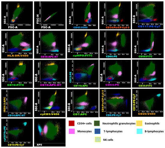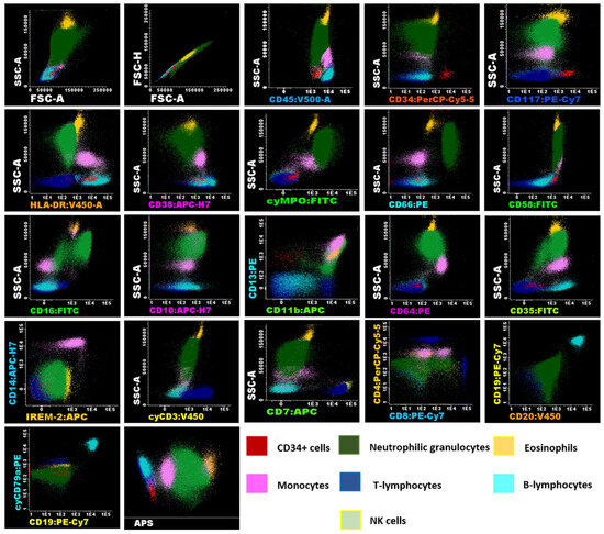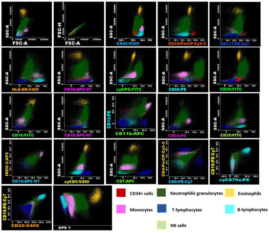Flow cytometry analysis of umbilical cord blood samples using EuroFlow panels of UCB cells after volume reduction (VR). Immunophenotypic analysis was conducted using Infinicyt™ version 2.0. (Cytognos SL) software using cells from Donor N° 5 (Table 1) after volume reduction (VR), displaying the expression of various markers analyzed in the antibody panels, which facilitates the identification of myeloid and lymphoid lineages in the samples. Identification of these populations was based on their characteristics, including SSC, FSC, the differential expression of CD45, and the presence or absence of other panel markers. The analysis revealed that CD34+ cells (shown in red), characterized by low SSC and FSC, expressed CD117+het/HLA-DR+/CD45+ dim/CD38+/CD58+/CD13+. Neutrophil granulocytes (shown in green), exhibiting high SSC and FSC, were CD45+/cyMPO+/CD66c+/CD58+/CD16+/CD10+/CD13+/CD11b+/CD64+dim/CD35+. Eosinophils (shown in orange), also with high SSC and FSC, were characteristically CD45+/CD58+/CD13+/CD11b+. The immunophenotype of monocytes (shown in pink), characterized by intermediate SSC and FSC, was CD45+/HLA-DR+/CD38+/cyMPO+dim/CD58+/CD13+/CD11b+/CD64++/CD35+/CD14+/IREM-2+. In the panels used, lymphocyte subpopulations (low SSC and FSC/CD45+) were characterized separately, including CD3+/cyCD3+/CD2+/CD7+/CD38+/CD58+ T cells (shown in blue), with CD4+ and CD8+ subgroups identified. B lymphocytes (shown in cyan) were CD19+/CD20+/cyCD79a+/HLA-DR+/CD38+/CD35+, and NK cells were CD2+/CD7+/CD38+. The analysis also included an APS (Automatic Population Separator) diagram based on principal component analysis (PCA), which clearly demonstrates the automatic n-dimensional separation of the major cell clusters within the sample.