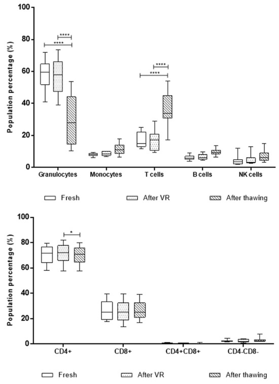 Box-and-whiskers plot of proportion in percentage of different populations in the 11 UCB units analyzed per flow cytometry. Analysis was performed with a two-way ANOVA test. The granulocyte population has significant differences in the three compared stages, fresh, after volume reduction, and after thawing, exhibiting a critical decrease after thawing. T cells’ proportion in the unit shows a significant increase after thawing compared with both fresh and after-VR stages. However, when sectioning the T cell population, the CD4+ population exhibits a slight decrease after thawing. (****) corresponds to p < 0.001, and (*) p ≤ 0.05.