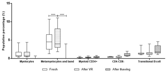 Box-and-whiskers plot with proportion of primitive cell populations compared in the three stages. There were only significant differences for the metamyelocyte and band cell population, which exhibits an important decrease after thawing compared with the fresh and after-VR stage. The remaining population’s proportion remained stable during UCB processing. Box-and-whiskers plot with proportion of immature myeloid cells compared in the three stages. There were no statistically significant differences for these populations during the process. (****) corresponds to p < 0.001.