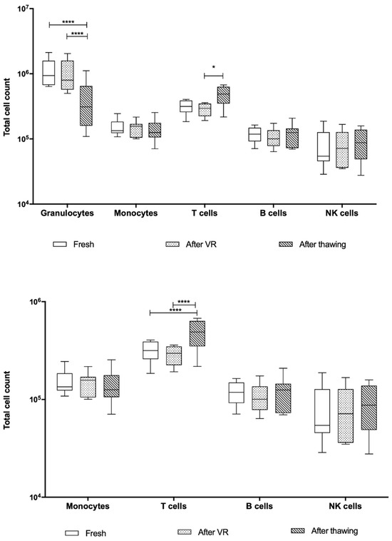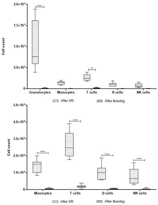 As mentioned previously, the single-platform measurement was only obtained for the after-VR and after-thawing stages. In both cases, the total CD45+ cell population and the number of cells per population were calculated based on the proportions obtained through EuroFlow. In this case, the total numbers are two orders of magnitude higher than those obtained using the hematology analyzer. The analysis excluding granulocytes was also carried out in this case, as shown in Figure 8.