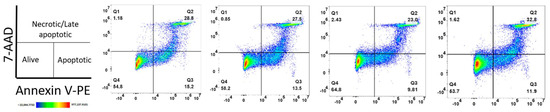 Then, we conducted a viability assay using Annexin V and 7-AAD on thawed cells from UCB bags that were not currently listed for transplantation. This approach enabled us to evaluate not only the percentages of necrotic or late apoptotic cells but also those undergoing early apoptosis due to thawing stress. As shown in Figure 9, the viability of four different UCB cell units ranged from 53.7% to 64.8%, while the percentage of cells in early apoptosis ranged from 9.81% to 15.2%. The proportion of cells in late apoptosis or necrosis ranged from 25.4% to 34.42%, as seen in Table S6. These results confirm the variability of UCB cells in cellular resistance to thawing process stress and the preservation of HSPC potency in these UCB units.