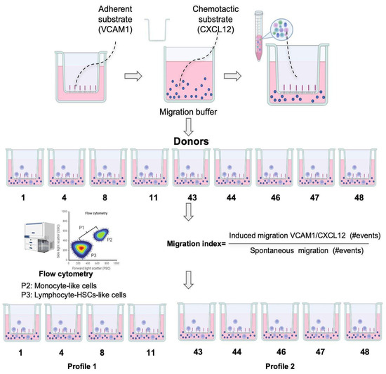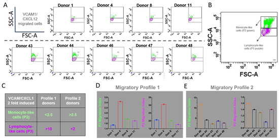 We focused on lymphocyte- and monocyte-like cells as these populations exhibited migration induced by VCAM1/CXCL12 stimuli, as shown in Figure 11. Figure 11A shows the FSC-A vs. SSC-A gating strategy used in a representative experiment for each donor. Figure 11B shows a density plot of migrated cells from one donor, where two different cellular populations based on FSC-A and SSC-A parameters were found. Analysis of density plots from different donors showed that the P2 population’s migration is increased in some donors (shown in Figure 11A, below the dotted line) while the P3 population’s migration induction is relatively higher in the plots from donors shown above the dotted line and classified as Profile 1, included in Figure 11C. When analyzing the migratory index for each donor, we could identify at least two profiles: those in which response towards VCAM1 and CXCL12 is mainly driven by lymphocyte-like cells and almost non-monocyte-like cells (Profile 1), and those in which migration is predominantly of the monocyte-like population, with lymphocyte-like cells barely induced by migratory stimuli (Profile 2) (Figure 11D and Figure 11E, respectively). For all donors from Profile 1, the migration index is higher than 15 in the lymphocyte-like cellular population, while in the monocyte-like cellular population, this index is less than 2.5. On the other hand, the cells from Donor Profile 2 had a lymphocyte-like induced migration index of less than 2 and a migratory index for monocyte-like cells reaching 10.