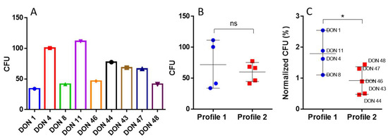 Colony-forming unit numbers of VCAM1/CXCL12 migrated cells from different UCB donors. (A). CFUs were analyzed for nine UCB donors. (B). Comparison between Profile 1 and Profile 2 donor cells’ ability to form colonies. (C). Normalized comparison of the percentage of CFU based on the total events counted through flow cytometry, as explained in the Methods section. (*) indicates p < 0.05, as evaluated by Mann Whitney test, ns, not significant.