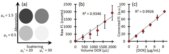 Calibration with free Dox provided the conversion between corrected fluorescence values and Dox concentrations, as shown in Figure 1. Figure 1a shows representative schematics of the four phantoms and their optical properties. Figure 1b shows the mean raw fluorescence signal for all four phantoms at each titration of Dox. The large error bars represent the standard deviations of the four phantoms and highlight the effects of background optical properties on the raw fluorescence. Figure 1c shows the corrected fluorescence ( from Equation (2)). The corrected fluorescence has much smaller error bars, highlighting the improved quantification. In addition, after the correction, the slope of the line directly relates the relationship between the corrected Dox fluorescence to the true Dox concentration so that one can extract the local Dox concentration for unknown samples.