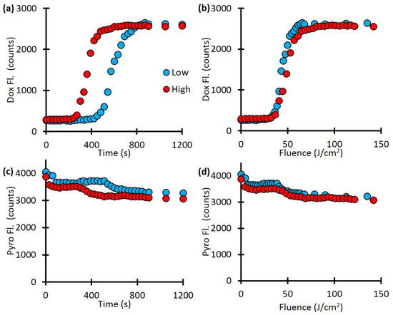 Next, we investigated the release kinetics with respect to light-irradiation fluence rate. Our fluorescence spectroscopy measurements showed a fluence-rate-dependent difference in drug-release kinetics (Figure 2a). At the lower fluence rate, Dox release started only after 450 s and was completed by 900 s, while at the higher fluence rate, Dox release started after 270 s and was completed by 510 s. This is a difference in release time: 450 seconds for the low fluence rate and 240 seconds for the high fluence rate. However, when the data are plotted as a function of light dose (mW/cm2), the two curves are much more similar (Figure 2b). As Figure 2c,d indicate, there was a decrease in the Pyro fluorescence as well, approximately from 4000 counts to 3000 counts, indicating the photobleaching of the porphyrin component.