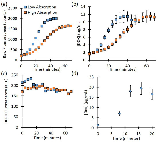 The fluence rate can be precisely controlled for optically clear phantoms in a cuvette. However, for turbid media, the true local-site fluence is unknown since the background optical properties will affect the delivered treatment light. The background optical properties will also affect the determination of fluorophore concentration. To mimic this condition, we checked the kinetics for high- and low-absorption cases. As Figure 3a shows, the raw fluorescence for phantoms with the same PoP−D liposome concentration showed different rates of release, as well as different values at full release. The phantom with lower background absorption showed a final Dox signal of 2000 ± 40 counts, while the higher-absorbance phantom showed 1700 ± 50 counts, a difference of 17.5%. However, after the Dox concentration had been quantified (Figure 3b), the full release values for the low- and high-absorbance phantoms were 11.4 ± 1.5 µg/mL vs. 11.5 ± 1.1 µg/mL, respectively, a difference of less than 1%. As Figure 3c shows, the signal from Pyro (PoP, HPPH) decreased slightly throughout treatment for both the low- and high- absorbance phantoms (26.8% and 10.4%, respectively). This decrease is likely due to the photobleaching of the Pyro.