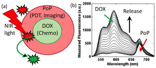 Liposomal formulation of a “nano-balloon” for imaging and treatment. (a) PoP red (or Dox) fluorescence can be used to localize the cancer cell. NIR light triggers release of the drug (Doxorubicin-Dox) when Dox is in the middle of the “nano-balloon”. When NIR light activates the PoP (HPPH-porphyrin), it releases the Dox. (b) The combined fluorescence spectra from Dox and PoP indicate that fluorescence increases during the release, which allows for an image-guided drug-delivery approach.