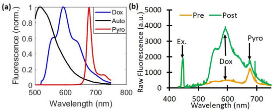 Dox and PoP (Pyro) fluorescence quantification. (a) The basis spectra of autofluorescence (Auto), Doxorubicin (Dox), and PoP were used to quantify fluorescence concentrations. (b) A representative raw fluorescence signal measured pre- and post-Dox release.