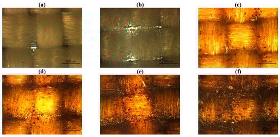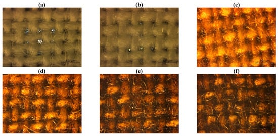 Figure 2, the incorporation of 5% lignin resulted in a perceptible alteration in the surface color of the fabric, accompanied by the detection of discrete lignin particles, mainly in the intersections of the warp and weft yarns. With the progressive increase in lignin concentration, the presence of these particles became increasingly prominent, leading to a gradual masking of the underlying polyester fabric, this effect being particularly pronounced in the fabric coated with 30% lignin. Nevertheless, despite the higher lignin content, lignin particles were distributed across the entire fabric’s surface.