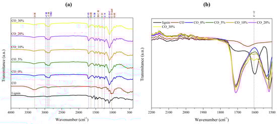 Figure 3b), which revealed the emergence of a new peak on the lignin-coated fabrics (CO_5%, CO_10%, CO_20%, and CO_30%), around 1600 cm⁻