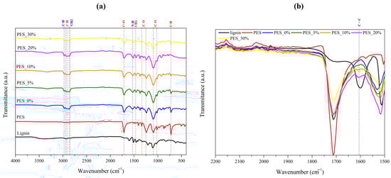 32]. This is related to the fact that there are common chemical bonds or bonds that vibrate at the same wavenumber in polyester and polyurethane. As observed in the cotton samples, the presence of lignin in the lignin-coated polyester fabrics (PES_5%, PES_10%, PES_20%, and PES_30%) was also identified upon a more detailed analysis of FTIR spectrums, as presented in