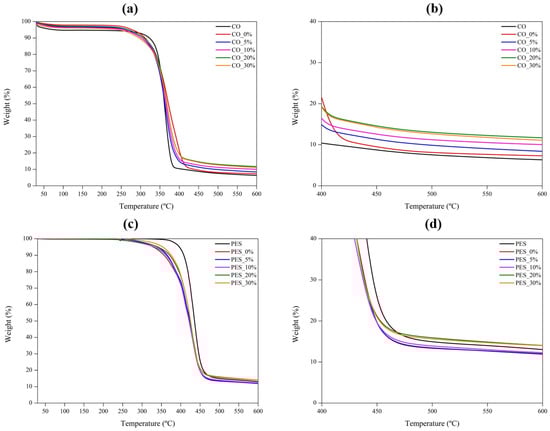 Figure 5c, the uncoated polyester fabric showed thermal stability up to approximately 300 °C, with no weight loss detected below this temperature. This can be attributed to polyester’s low moisture adsorption capacity, which prevents early-stage weight loss associated with water evaporation. The most pronounced thermal degradation occurred between 350 °C and 500 °C, corresponding to the breakdown of the polymer chains, particularly the ester bonds [