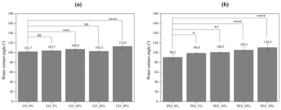 Figure 6b, respectively. The water contact angle of both the uncoated cotton (CO) and polyester (PES) fabric is not presented since the water drop was instantly absorbed, making it impossible to measure the contact angle. This rapid absorption not only confirms the hydrophilic nature of cotton, as consistently reported in the literature [