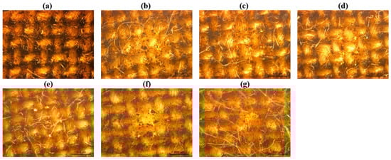 Figure 7g). This effect may be attributed to partial softening of the polyurethane polymeric base, which according to the datasheet of Edolan SN, happens around 130–150 °C, allowing fibers to detach more easily from the fabric’s surface due to compression and consequently decompression. However, in contrast to the washing cycles, the amount of lignin on the fabric surface appeared unaffected by hot-pressing, indicating that the thermal treatment did not significantly compromise the integrity of the coating.