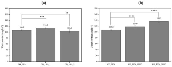 Figure 8b presents the results of the hot-pressing treatment. A significant increase in the contact angle was observed after both 110 °C and 200 °C treatments, with values rising to 117.9° and 136.2°, respectively, which indicated that hot pressing did not decrease the hydrophobicity of the coated samples, but instead increased it, almost reaching values close to the super-hydrophobic behavior (≥150°) [