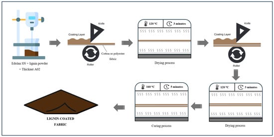 Figure 5d. As previously mentioned, this behavior can be related to the slower thermal degradation rate of lignin, as well as its highly aromatic structure, which promotes the formation of a substantial amount of char residue, improving the thermal stability of the coated fabric and reducing the overall weight loss of lignin coated samples [