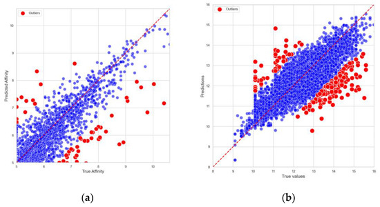 Comparison between predicted and actual affinity values. (a) Comparison of true and predicted values on Davis dataset; (b) comparison of true and predicted values on KIBA dataset. Outliers are depicted in red, and normal values are depicted in blue.