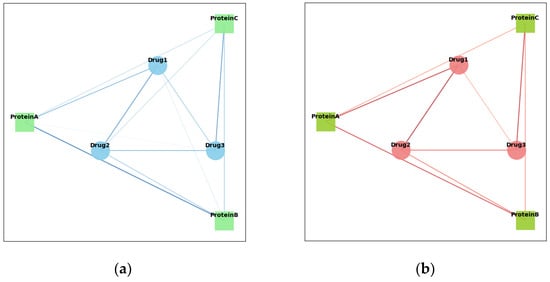 To better understand the proposed variable heterogeneous graph prediction model, a visual analysis of the constructed drug–protein heterogeneous graph is conducted. In traditional static graph structures, the edges are usually based on predefined similarity or interaction strength. However, in our model, the edges are adaptively optimized according to the features of the nodes. This dynamic adjustment mechanism allows the graph structure to continuously evolve during training, providing a more accurate reflection of the affinity relationship between drugs and proteins.