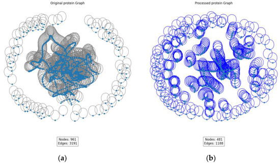 Processing of the first protein graph in Davis dataset. The blue nodes represent amino acid residues, and the circles represent the connections between these amino acid residues. (a) Initial protein graph; (b) protein graph after GIN and SAGPooing.