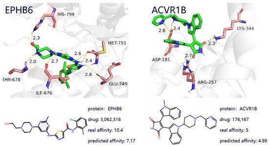 To further investigate the effectiveness of the proposed method, this study presents two case studies of drug-target complexes, which provide deeper insight into DTA prediction and contribute to understanding the potential mechanisms behind protein-target-based drug discovery. As shown in Figure 5, the left panel illustrates the complex between the targeted drug Dasatinib and the gene EPHB6, while the right panel shows the complex between the targeted drug Enzastaurin and the target ACVR1B. By utilizing known drug-target binding examples, the effectiveness and practicality of the proposed model in real-world applications are validated.