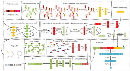 - First, a mechanism was designed to dynamically adjust the connection strengths between drug–drug, protein–protein, and drug–protein interactions, constructing a variable heterogeneous graph structure in order to deeply explore drug-target interactions.