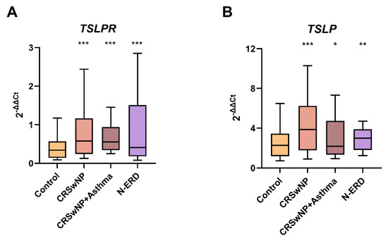 The boxplots illustrate (A) The expression of TSLPR in peripheral blood and (B) The expression of TSLP in peripheral blood. CRSwNP: chronic rhinosinusitis with nasal polyposis without asthma; N-ERD: NSAID-exacerbated respiratory disease; *** p < 0.001; ** p < 0.01; * p < 0.05; p-value of the Kruskal–Wallis test for each group of patients vs. controls.