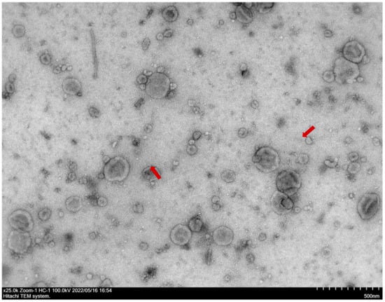TEM image showing EVs isolated from saliva fluid pooled from multiple patient samples. The scale bar represents 500 nm. Arrows point to two representative structures.
