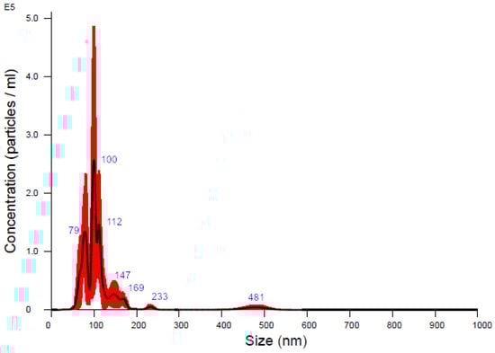Following the isolation and analysis of salivary samples, transmission electron microscopy (TEM) confirmed the presence of EVs in the samples from patients undergoing orthodontic treatment. In the TEM analysis (Figure 1), the EVs appeared as spherical structures, with some exhibiting a distinct membrane-like structure. A complementary size distribution analysis via nanoparticle tracking confirmed that the majority of the EVs were between 100 and 150 nm in diameter, with a peak concentration around 100 nm (Figure 2). These findings confirm the successful isolation and identification of extracellular vesicles, which provide a viable source for a further miRNA analysis relevant to bone-remodeling processes during orthodontic treatment.