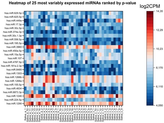 Heatmap of the 25 most variably expressed miRNAs ranked by p-value < 0,05. The expression levels (log2CPM) are shown across saliva samples with the miRNA. The color scale ranges from blue (low expression) to red (high expression).