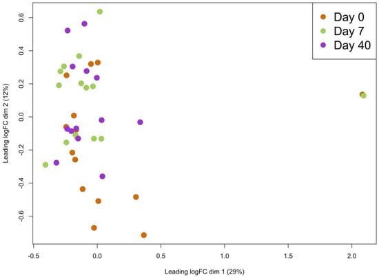 MDS plot showing the separation of samples across three time points (Day 0, Day 7, and Day 40) based on the log fold change (logFC). Each point represents a sample, with the colors indicating the corresponding time points: orange for Day 0, green for Day 7, and purple for Day 40. The leading dimensions 1 and 2 explain 29% and 12% of the variance, respectively.