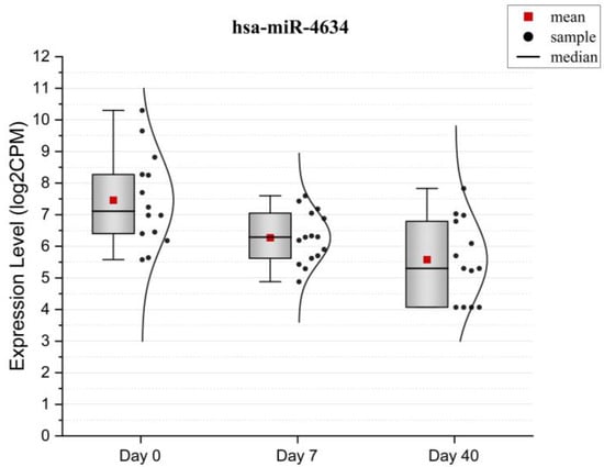 Boxplot of hsa-miR-4634 expression levels (log2 CPM) at three time points (Day 0, Day 7, and Day 40). The red square represents the mean expression level, and the black dots represent individual samples. The black line in each box indicates the median value, and the density plot on each side shows the distribution of expression values.