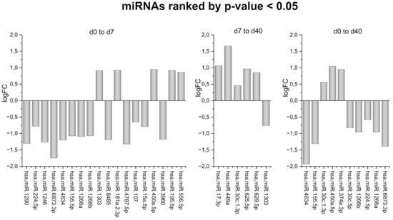 Bar plots showing the log fold changes (logFC) of miRNAs ranked by p-value < 0.05 across different time point comparisons: Day 0 to Day 7, Day 7 to Day 40, and Day 0 to Day 40. Each bar represents an miRNA, with positive and negative values indicating upregulation and downregulation, respectively, between the compared time points. The data presented represent the combined analysis of all the included samples rather than individual patient data.