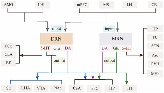 The efferent and afferent fibers of MRN correspond to midline structures, whereas those of DRN correspond to lateral structures. Both MRN and DRN innervate CeA, PFC, and HP. Abbreviations: DRN: dorsal raphe nucleus; MRN: medial raphe nucleus; AMG: amygdala; LHb: lateral habenula; mPFC: medial prefrontal cortex; MS: medial septal area; LH: lateral hypothalamus; CB: cerebellum; Pcx: piriform cortex; CLA: claustrum; BF: basal forebrain; Str: striatum; LHA: lateral hypothalamic area; VTA: ventral tegmental area; NAc: nucleus accumbens; CeA: central amygdala; PFC: prefrontal cortex; HP: hippocampus; HT: hypothalamus; FC: frontal cortex; SCN: suprachiasmatic nucleus; Arc: arcuate nucleus; PVH: paraventricular hypothalamic nucleus; MHb: medial habenula.