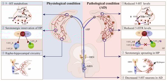 AD is the most common type of neurodegenerative diseases in the elderly, and it has been well established that the clinical symptoms of AD are characterized by β-amyloid (Aβ) plaques, phosphorylated Tau, and gliosis in the cerebral parenchyma, resulting in progressive cognition decline []. In addition to the obvious cognitive deficits, AD patients also suffer from anxiety [], depression [] and sleep disturbances []. These psychiatric disorders have linked the disrupted raphe–hippocampal circuitry to cognitive decline in AD (Figure 4).
