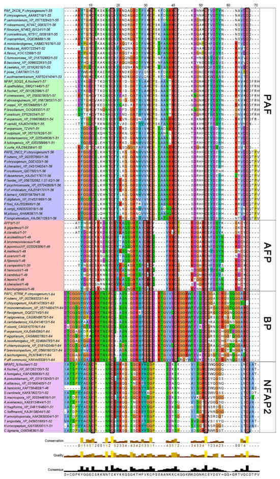 Multiple sequence alignment of AFPs’ amino acids. The alignment displays six AFPs (from top to bottom: PAF, NFAP, PAFB, AFPg, PAFC, and NFAP2) categorized into four groups based on prior phylogenetic clades: I-PAF (including PAF, PAFB, and NFAP), II-AFP (AFPg), III-BP (bubble protein, the class that includes PAFC due to their similarities), and IV-NFAP2 [55]. The conserved cysteines are highlighted using black rectangles. Below the alignment, metrics such as conservation, quality, and consensus are shown, representing the degree of amino acid conservation, sequence alignment quality, and consensus symbols, respectively. Amino acid sequences were downloaded from NCBI database after protein–protein BLAST searching, aligned using BioEdit, and analyzed and grouped with JalView. ClustalX scheme was used to indicate the conserved residues.