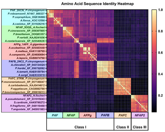 Heatmap of AFPs’ amino acid sequence identity. A light-colored large block along the diagonal represents Class I, while two smaller, brighter blocks in the bottom-right corner correspond to Classes II and III. The sequences are divided into six groups from top to bottom and left to right: PAF, NFAP, PAFB, AFPg, PAFC, and NFAP2, arranged in the same order as the sequence alignment. Each small square represents a numerical value, with the color gradient indicating the value intensity. (The sequence identity matrix was calculated using BioEdit, and the heatmap was generated with GraphPad.)
