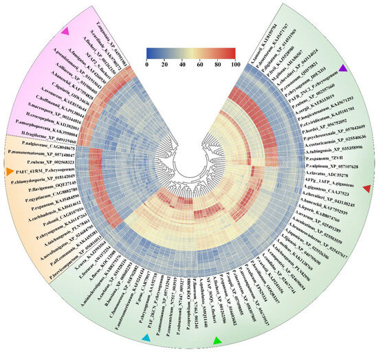 Amino acid sequence similarity cluster tree and heatmap of AFPs. The fan-shaped regions are arranged from inner to outer layers in the same order as the sequence alignment. Each small fan-shaped region represents a numerical value. The value is expressed as a percentage, ranging from 0 to 100. Classification is based on similarity: Class I (pink), Class II (orange-yellow), and Class III (green). The three sectors show low similarity to each other. The light yellow region represents Class I, where the similarity between subgroups causes some grouping shifts in the amino acid sequences, resulting in not every red region containing 15 sequences. (Generated using TBtools [56].)