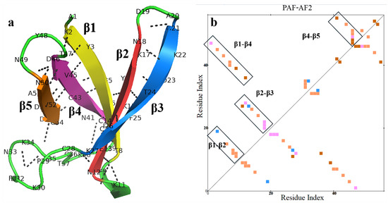 In November 2020, the results of the 14th Critical Assessment of Structure Prediction (CASP14) competition showed that the AI-based AF2 developed by DeepMind outperformed all other methods [43,57]. AF2 has achieved experimental-level accuracy in protein structure prediction, particularly for small molecules [43]. As small cationic mini-proteins (typically characterized by an amino acid length of 50–100 residues [58] and a molecular weight of <10 kDa [59]), AFPs were predicted in 3D using AF2 in the template-free mode. The AF2 prediction for PAF was compared with the NMR structure of PAF (optimized structure, Protein Data Bank [PDB] ID: 2MHV). The comparison revealed that the predicted structure exhibited very high confidence, with interface-placed distance-dependent test (IPDDT) deep blue, and was highly consistent with the NMR structure in terms of the five anti-parallel β-strands. However, there were some geometric and spatial orientation differences in the unstructured regions. The AF2 structure of PAF displayed a longer β-chain than the NMR structure (Table 1), with an α-helix formed between β1 and β2 by Lys9, Ser10, and Lys11. The hydrogen bonds formed by the main chain of the amino acids (Thr8-Lys11, Thr8-Asn12, Thr8-Glu13, Lys9-Asn12, and Lys6-Lys15) help to stabilize the α-helix and β-topology. The hydrogen bond distribution shows four linear regions along one side of the diagonal, stabilizing the β-topology between the β-strands (β1-β2, β2-β3, β1-β4, and β4-β5), thus maintaining the structural integrity of the protein’s β-fold (Figure 4a,b).