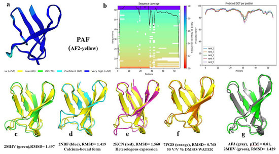Comparison of the AF2-predicted structure with the NMR structures of PAF. (a) AF2-predicted confidence scores. (b) Predicted sequence coverage and residue scores. (c–f) Comparison of the AF2 model with the NMR structure in different solvents. (g) The AF3-predicted structure.