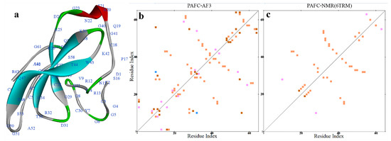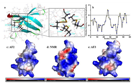 Disulfide bonds play a crucial role in stabilizing the PAF structure [9,10,11,12]. The AF2 results for PAF indicate a disulfide bond pattern of “abcabc; 7-36, 14-43, 28-54” (Figure 6a), which is fully consistent with previous studies on PAF [12]. Hydrophobicity analysis using a five-residue sliding average [60] (Figure 6b) reveals that PAF is mostly hydrophilic. The sequence contains thirteen positively charged hydrophilic lysine (K) residues (23.6%), seven negatively charged hydrophilic aspartic acid (D) residues (12.7%), and seven neutral hydrophilic asparagine (N) residues (12.7%). The average sliding values for hydrophilic residues are as follows: K11: -3.12, K17: -3.22, D39: -3.02, and N40: -3.66, while the highest sliding average for hydrophobic residues is observed at I26: 1.04. A comparison of the surface electrostatic potential energies among the three models, including AF3, reveals subtle conformational differences, resulting in variations in surface charge distribution. However, all three models exhibit a predominantly positively charged surface with basic residues. A notable difference is found in the third β-strand, where residues D23, T24, and F25 in the NMR structure (PDB ID: 2MHV) are exposed on the surface (Figure 6c–e), while in the AF2 and AF3 models, these residues are buried within the protein and do not present a negative charge, indicating deeper conformational differences between the NMR and AF structures.