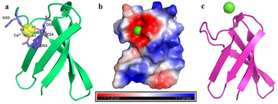 In addition to predicting the PAF structure, we also utilized AF3 to investigate interactions with metal ions. We simulated PAF complexes with varying numbers of Ca2+, Mg2+, and Na+ ions (one to four ions) to explore the structural interactions between PAF and these metal ions. The results (Table 2) revealed that while the structure prediction scores for all complexes remained high, the reliability and accuracy of docking decreased as the number of metal ions increased, showing a negative correlation. This suggests that PAF may bind to specific regions with a smaller number of metal ions, possibly due to spatial constraints. The Ca2+ ion was predicted to bind to a negatively charged surface region at the C-terminus of PAF, interacting with the oxygen atoms of residues N33, D53, C54, and D55 (Figure 7a,b). However, no distinct specificity was observed in the interactions, as all Ca2+, Mg2+, and Na+ complexes with PAF showed good binding scores. Additionally, we predicted complexes of PAF and its mutant variants with two metal ions. Although the binding scores for all experimental groups were high, the two metal ions in each group interacted with N33, D53, C54, and D55, showing no priority or competition in the interaction between these ions and PAF. In a previous study, we found that PAF and its mutant PAFD19S are sensitive to Ca2+, affecting its antifungal activity in a concentration-dependent manner [11]. While the Ca2+ binding to PAF is relatively weak, it is specific. The primary Ca2+ binding site in PAF is located at the C-terminus, which was supported by molecular dynamics (MD) simulations. We confirmed that Asp53 and Asp55, along with the C-terminal carboxyl group, form the preferred Ca2+ binding site in PAF [61]. Furthermore, we predicted the complex of Ca2+ with the PAFD53S-D55S mutant (Figure 7c). In this mutant, Ca2+ failed to interact with the protein and only interacted with the solvent (water), confirming the importance of the D residues at the C-terminus for Ca2+ binding. Previous studies have shown that mutating D53 and D55 to serine does not significantly affect the activity of PAF [61].