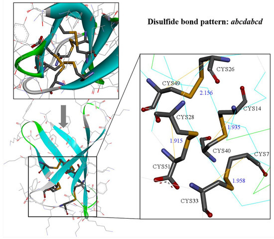 Although AF2 has shown remarkable performance in recent years, it is not perfect for AFPs. AF3, released this year (2024), has proven to be even more reliable. The disulfide bonds between cysteine residues play a crucial role in stabilizing the protein structure. These disulfide bonds are highly stable across a wide pH range and at high temperatures, preventing proteolytic degradation [44]. It has been demonstrated that the presence and correct formation of disulfide bonds are vital for both structural integrity and antifungal activity [29,34]. In PAF, PAFB, and NFAP, six cysteine residues form three disulfide bonds in an abcabc pattern [9,11,12,62], whereas in AFP and PAFC, four disulfide bonds connect eight cysteines, allowing for multiple possible pairing combinations, resulting in a relatively complex pattern [10,19]. Notably, the C-terminal of AFPg features two cysteine residues separated by an amino acid, complicating the disulfide bond formation. Indeed, AF2 models show suboptimal performance in predicting correct disulfide bond pairings in AFPs, while AF3 accurately predicts all disulfide bond pairings (Table 1). Despite the structural similarities between AF2 and AF3 predictions, AF2 did not correctly predict the disulfide bond pairings for NFAP [20], AFPg [34], or PAFB [18], whereas AF3′s predictions correctly identified the disulfide bonding patterns (Table 1). Interestingly, the NMR results for AFPs show that due to the spatial proximity of C14, C27, C42, and C53 in NFAP, the disulfide bonds formed are twisted, leading to potential geometric distortions. Such irregularities may interfere with the protein’s overall conformation and stability. Previous NMR studies on the solution structure of AFPg also suggested the presence of non-native disulfide bond conformations, yielding conflicting results [19]. AFPg contains eight cysteine residues, complicating the correct pairing of cysteine thiols and resulting in 105 possible pairing combinations. The interlocking abcdabcd disulfide bond pattern is considered the most likely for AFPg and has been confirmed by recent chemical synthesis strategies using semi-orthogonal thiol protection groups. These strategies validated the disulfide bonds between cysteines 26 and 49 and 28 and 51 (Table 1), supporting the abcdabcd pattern. However, the precise pairing remains unclear [34,62]. In the AF3 predictions, we observe eight cysteines forming four disulfide bonds in an abcdabcd pattern: 7-33, 14-40, 26-49, and 28-51, stabilizing the β-barrel topology formed by five antiparallel β-strands (Figure 8), which aligns with experimental hypotheses and provides substantial support for this disulfide bond arrangement.