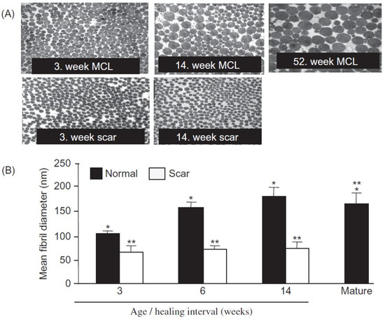 Failure of collagen fibril diameters to increase in the injured rabbit medial collateral ligament (MCL) during healing. (Panel A): Collagen fibril diameters in healing MCL scars at 3- and 14-weeks post-injury compared to those in the MCL during normal age-related maturation. (Panel B): Quantitation of collagen fibril diameters in the healing MCL compared to normal development. * p < 0.05 compared to corresponding normal development values; ** p < 0.05 compared to 52 week mature values. Reprinted with permission from Achari et al. [106].