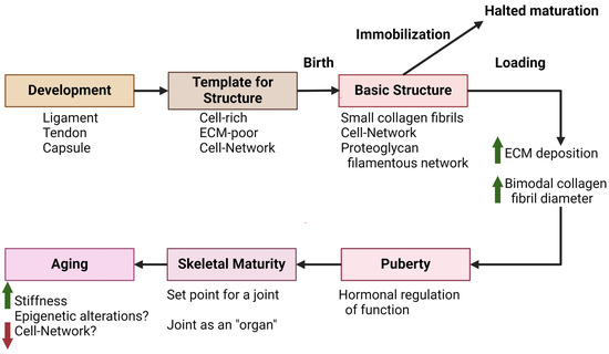In summary, development, growth, and maturation of connective tissues of a joint occurs in a coordinated manner, leading to an integrated organ system (Figure 3). The successful formation of a mature joint with an appropriate structure and biomechanical properties is then posed to accommodate stressors placed on them over the course of the ensuing decades of life.