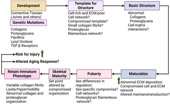 Therefore, several aspects of joint development and function during the phase of the life cycle associated with fairly rapid growth and maturation progress normally in individuals with joint hypermobility associated with genetic mutations, as well as those with hEDS. Thus, the spectrum of mutations in molecules that are very relevant to effective ECM composition and structural organization (i.e., collagens, proteoglycans, growth factors, fibrillins, tenascins, enzymes) still leads to a functional joint, albeit joints with an altered phenotype. Details regarding how this can be accomplished in the presence of different mutations could lead to not only new approaches to intervene early with such individuals, but also to a better understanding of how normal development followed by growth and maturation is regulated.