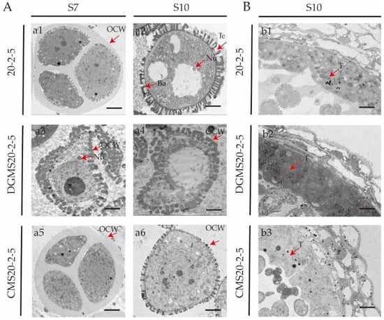 Transmission electron microscopy (TEM) analysis of microspores from 20-2-5, DGMS20-2-5, and CMS20-2-5 at anther stages S7 and S10. (A) Comparison of pollen grains. (B) Comparison of the exine structure of pollen. T, tapetum; OCW, outer cell wall; Te, tectum; Ba, bacula; Nu, nucleus; scale bar = 2 μm.