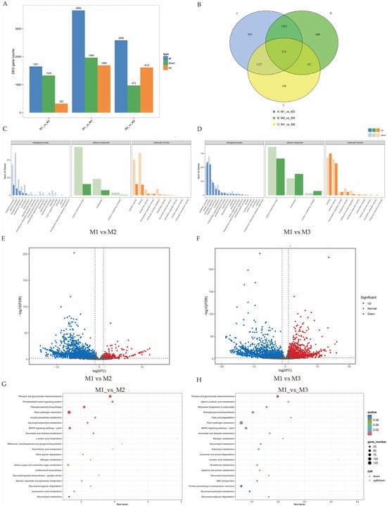 Distribution characteristics of differentially expressed genes (DEGs) in M1, M2, and M3. (A) Number of DEGs between comparison pairs. (B) Venn diagram illustrating the distribution of differentially expressed genes in the three groups. (C) GO annotation classification of differentially expressed genes in M1_vs_M2. (D) GO annotation classification of differentially expressed genes in M1_vs_M3. (E,F) Volcano plot of differential gene expression. (G,H) KEGG enrichment bubble plot of differentially expressed genes, where each circle represents a KEGG pathway. The vertical axis indicates the pathway name, and the horizontal axis represents the Rich factor, which is the ratio of the proportion of genes in the differentially expressed genes annotated to a pathway to the proportion of all genes annotated to that pathway.