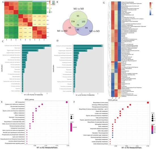 (A) Inter-sample correlation analysis. (B) Venn diagram illustrating the distribution of differential metabolites across the three groups. (C,D) Statistical analysis of differential metabolites based on annotations from the HMDB database. (E,F) KEGG enrichment analysis of differential metabolites. (G) Clustering heatmap of the 75 shared DAMs across M1, M2, and M3.