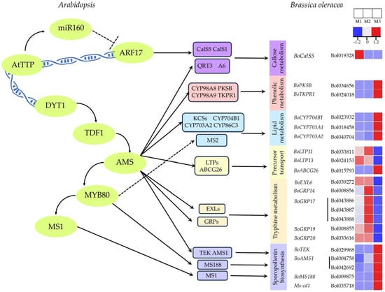 In the model plant Arabidopsis thaliana, the DYT1-TDF1-AMS1-MS188-MS1 pathway regulates tapetum layer synthesis, with several genes in this network also involved in pollen wall formation and microspore development. The bHLH transcription factor ABORTED MICROSPORES (AMS), expressed in the Arabidopsis tapetum, is a key regulator of pollen wall development. AMS regulates several processes, including callose metabolism (CalS5), lipid metabolism (CYP703A2 and CYP704B1), sporopollenin formation (PKSB and TKPR1), tryphine production (EXLs and GRPs), and lipid transport (ABCG26) [,,]. In the present study, we examined the expression of Arabidopsis homologous genes within this regulatory network in Brassica (Figure 4). Notably, the expression patterns of several genes in this pathway exhibited divergent trends between M2 and M3.
