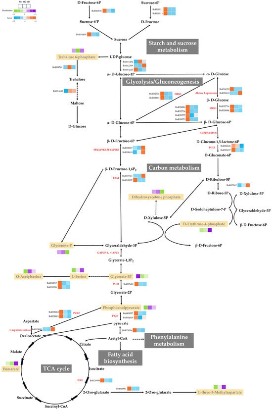 In CMS line, glycolytic enzymes such as PFK3, PFK2, PFK7, and L-aspartate oxidase were upregulated in the M3 samples. This regulation impaired the production of glucose-6-phosphate and fructose-6-phosphate, decreasing the accumulation of these intermediates and elevating glucose levels, as confirmed through GC-MS analysis. The increased expression of fructose–bisphosphate aldolase 6 (Bol037713), coupled with the reduced expression of phosphoglycerate mutase-like protein (Bol005481), suggests the enhanced accumulation of glyceraldehyde-3-phosphate in CMS line. Furthermore, the downregulation of PKp3 and PKP-BETA1 pyruvate kinase in the gluconeogenesis pathway reduced acetyl-CoA production, limiting its entry into the TCA cycle. In the TCA cycle, CMS line exhibited decreased IDH (Bol029959) expression and suppressed oxaloacetate breakdown due to PCK2 downregulation, increasing the accumulation of intermediates such as 2-oxoglutarate, succinyl-CoA, succinate, fumarate, and malate. The metabolomic analysis confirmed a significant increase in fumarate content in the CMS line compared with the DGMS line, which accumulated comparatively less.
